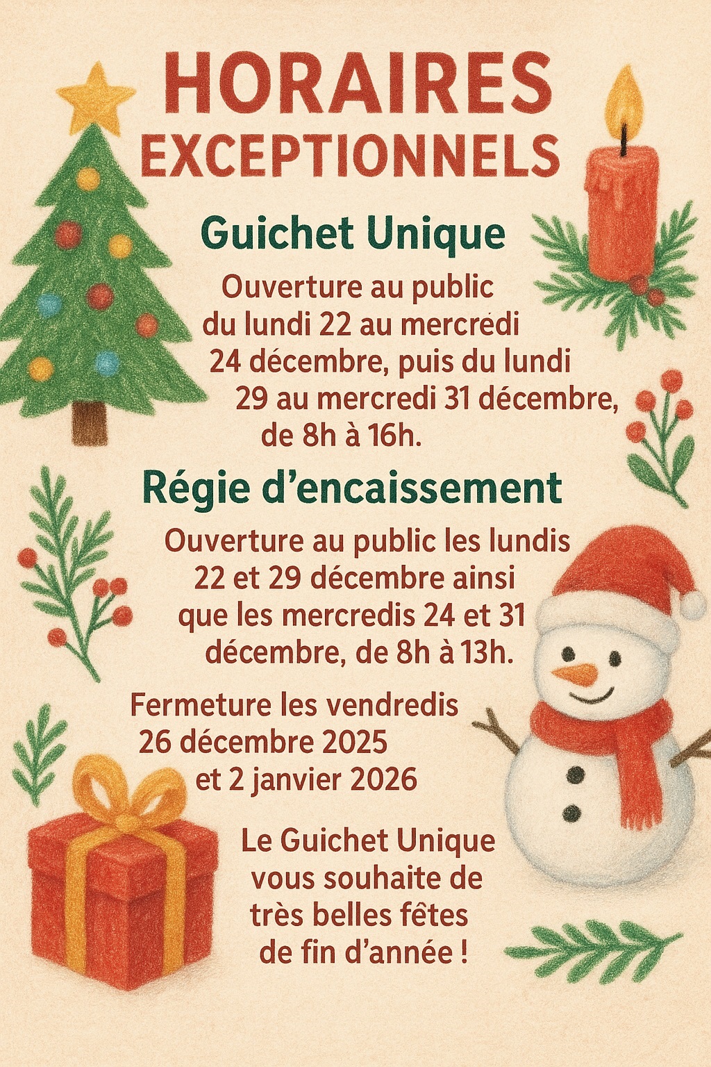 Fermeture les vendredis 26 décembre 2025 et 2 janvier 2026.